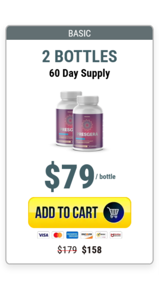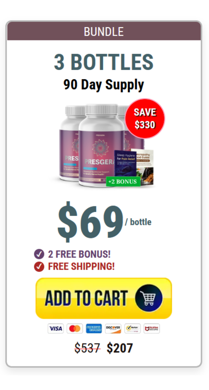PRESGERA features a premium formula with carefully selected ingredients for effectiveness and safety at any age. Produced under strict quality standards and crafted with research-backed nutrients, it prioritizes your nerve health, comfort, and overall well-being.